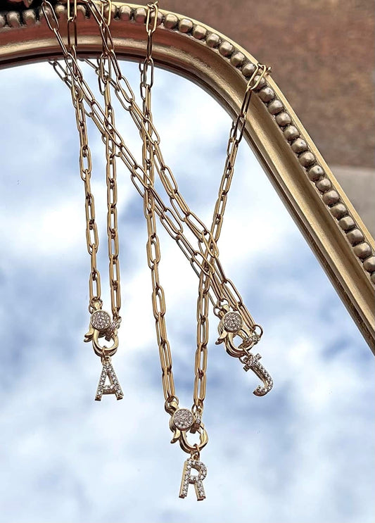 Gold Paperclip Rhinestone Initial Necklaces- 17 Letters