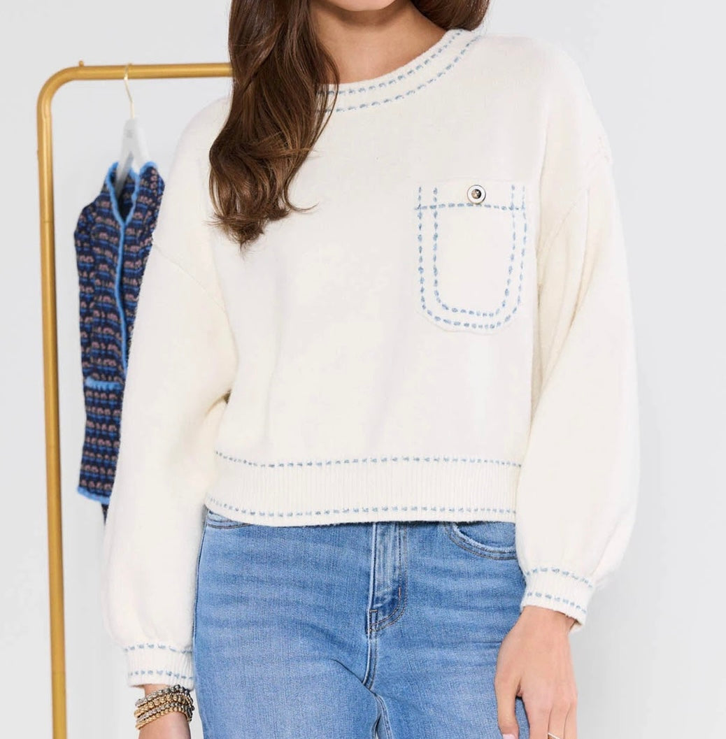 Soft Knit Sweater With Baby Blue Stitch On Collar And Cuff Sleeve