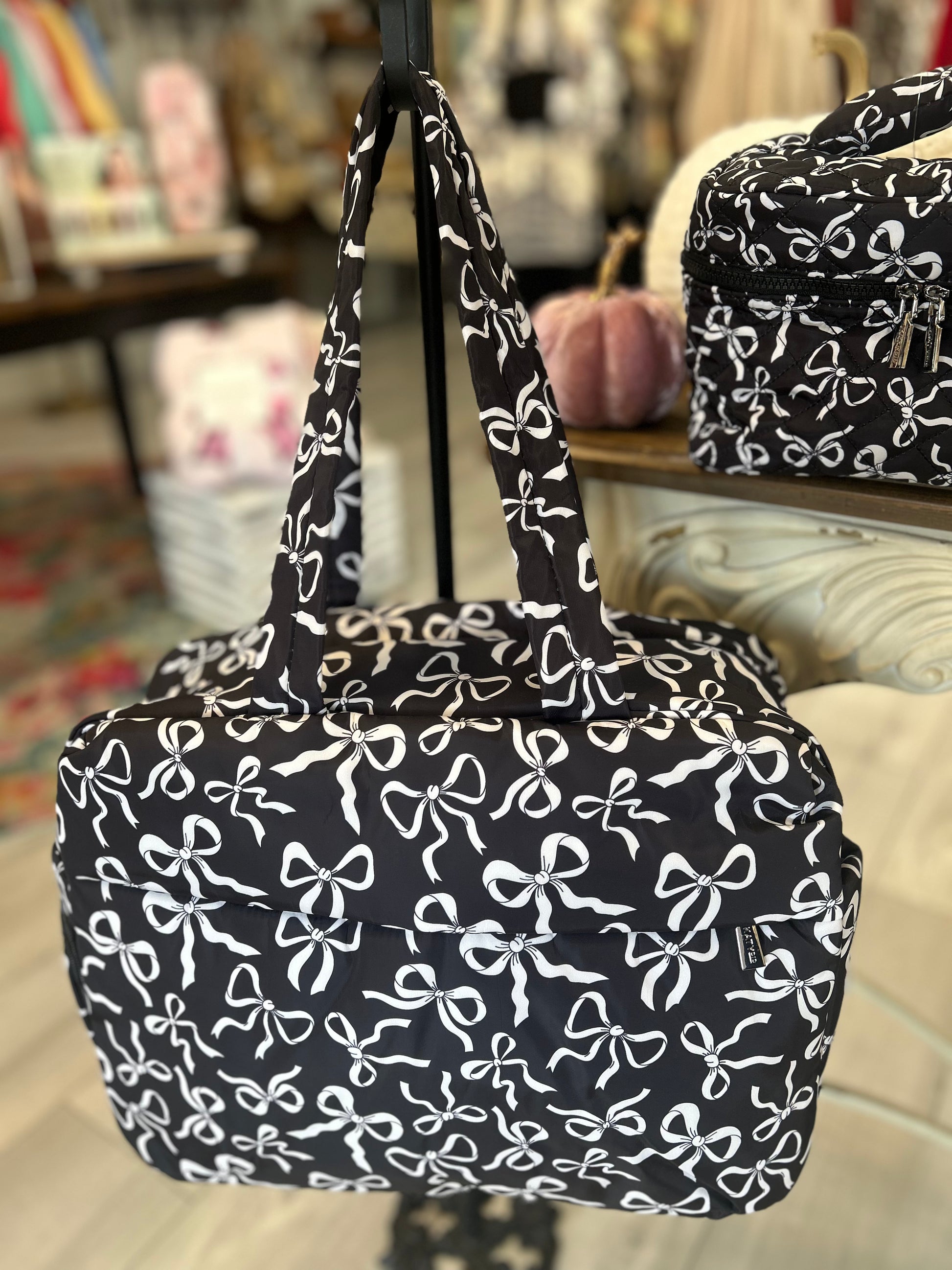 Stay in style with this quilted bow weekend bag. Grab the matching cosmetic bag.
