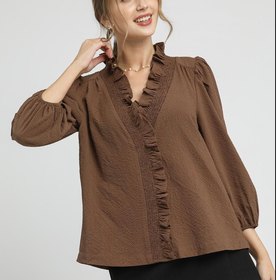 Button front with beautiful ruffle neckline. Pairs beautifully for dressy or casual.