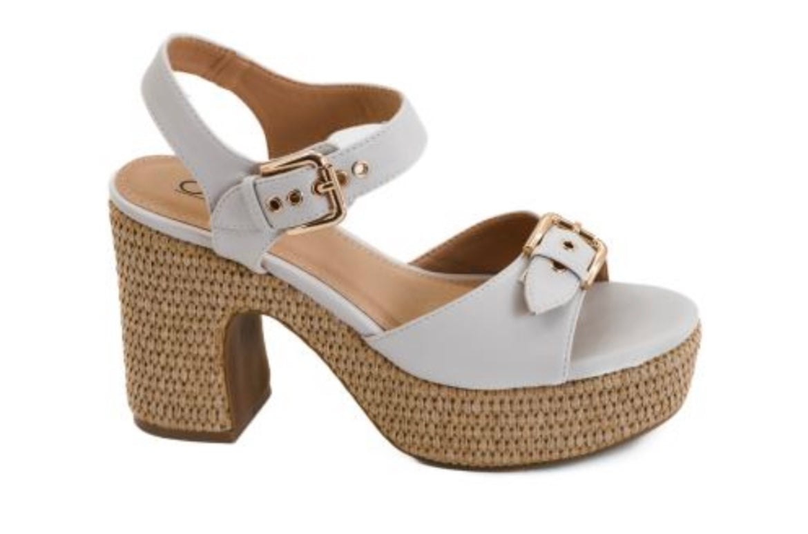 Make a stylish statement with this elevated platform heel sandal, designed to blend modern structure with warm-weather charm. Featuring a smooth upper with bold buckle accents, an adjustable ankle strap for a secure fit, and a cushioned footbed, it offers both comfort and confidence. The woven platform and sturdy block heel add height with stability, making it perfect for dressing up casual looks, summer events, or nights out with effortless sophistication.