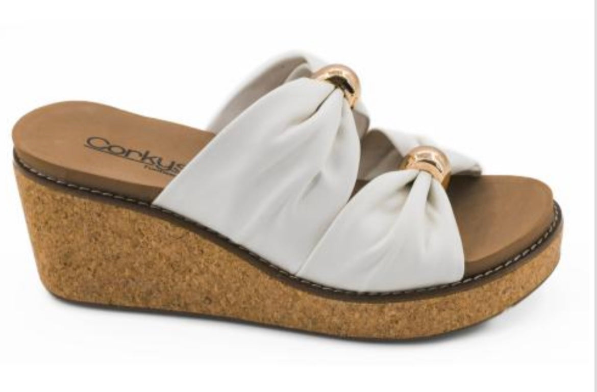Elevate your warm-weather looks with the Corkys Miss Understood Ivory Wedge Sandal-where effortless style meets all-day comfort. Designed with an ivory faux leather upper, this chic slide-on sandal features twisted straps accented with delicate gold bead details for a touch of subtle glamour. A cushioned memory foam footbed keeps every step comfortable, while the cork wedge adds both height and stability. Finished with a modern square-round toe, this versatile sandal pairs perfectly with everything from sundresses to denim.