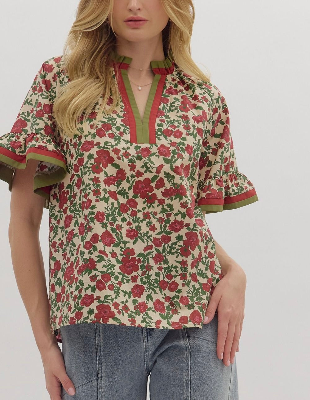 Floral print short ruffle sleeve top featuring contrast trim at neck and sleeve. Pleated ruffle neck. Unlined.