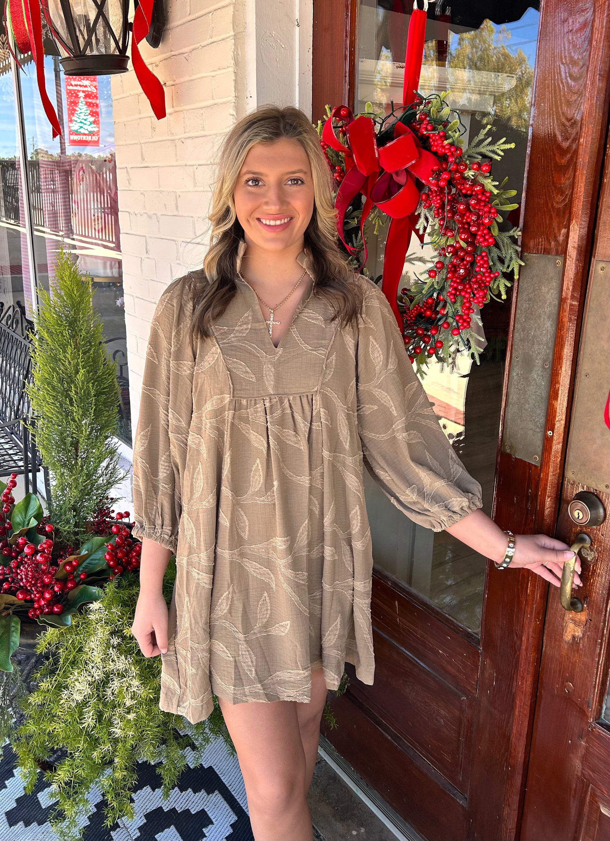 Babydoll style dress with textured leaf detail.