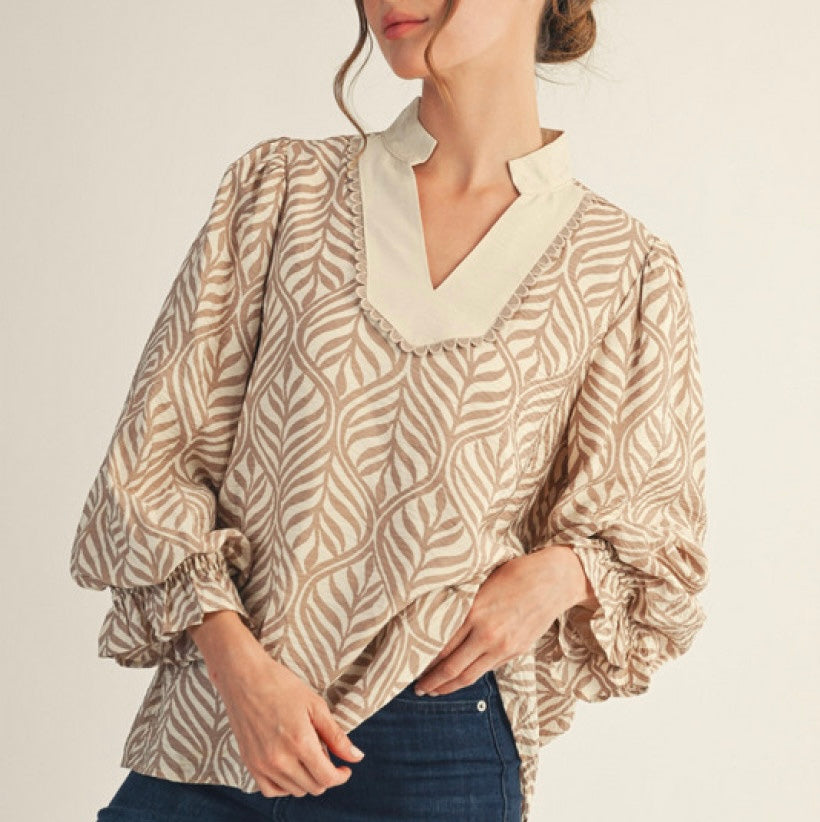 3/4 sleeves boho leaf print top, standing collar neckline, solid contrast, lace trim.