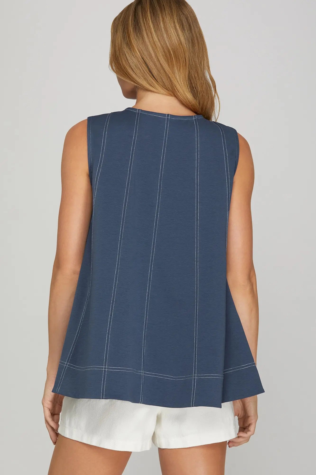 Sleeveless knit top with contrast stitch detail. This top is perfect with shorts or pants.