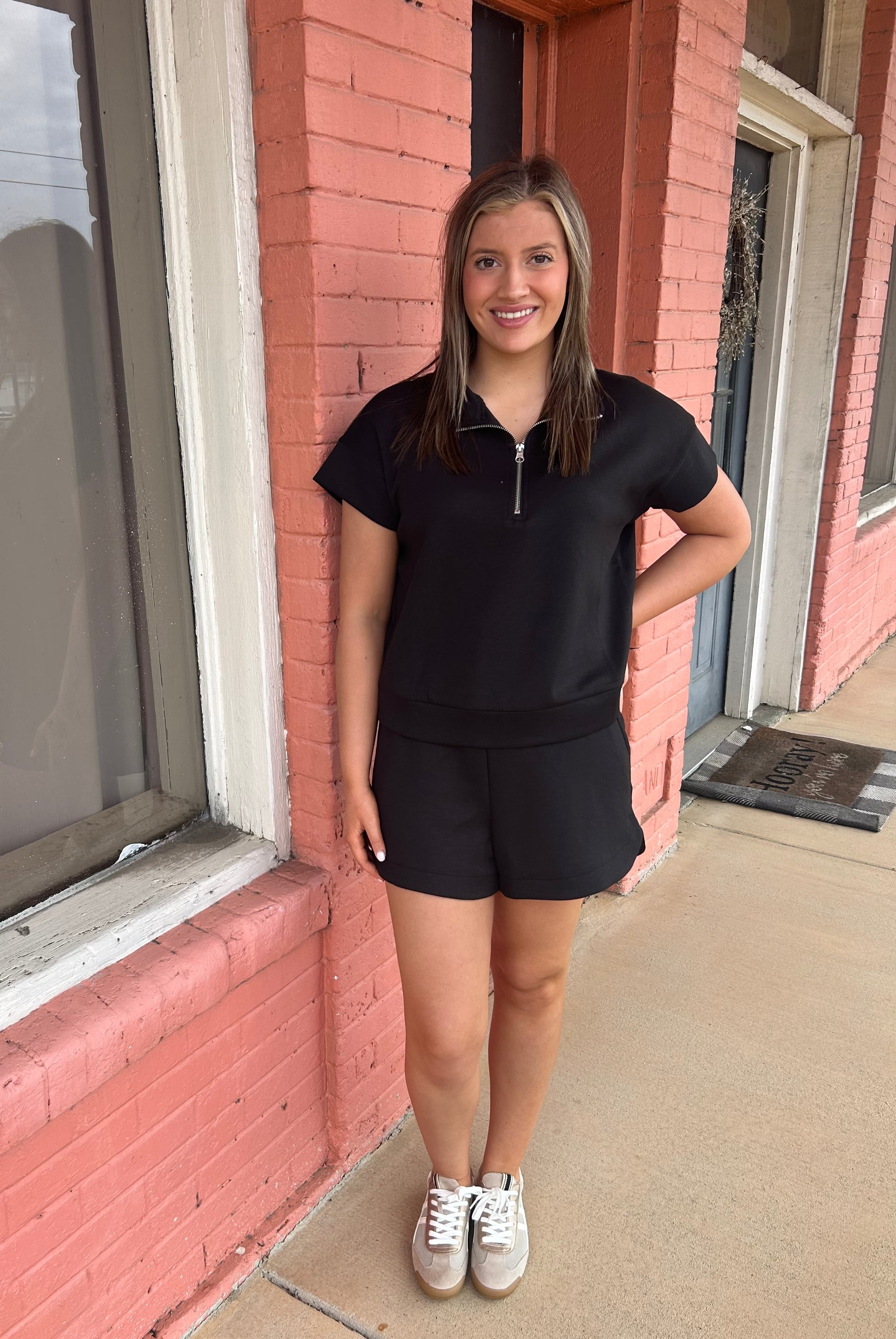Soft scuba fabric short set with zip at the neck. Perfect for acute casual look.
